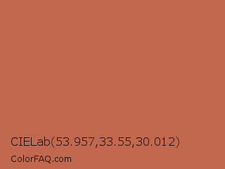 CIELab 53.957,33.55,30.012 Color is a normal red color and the nearest color is Copper Red #cb6d51. Hex code #c2684f and RGB value is rgb(194,104,79). In RGB color space, this color is composed of 76% red, 41% green, 31% blue, In CMYK color space, this color is composed of 0% cyan, 46% magenta, 59% yellow , 24% black , In HSL color space, this color has a hue angle of 13° , 49% saturation and 54% lightness.