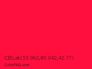 CIELab 53.962,80.042,42.77 Color is a normal red color and the nearest color is Torch Red #fd0e35. Hex code #ff0f3d and RGB value is rgb(255,15,61). In RGB color space, this color is composed of 100% red, 6% green, 24% blue, In CMYK color space, this color is composed of 0% cyan, 94% magenta, 76% yellow , 0% black , In HSL color space, this color has a hue angle of 349° , 100% saturation and 53% lightness.