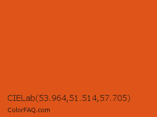 CIELab 53.964,51.514,57.705 Color is a normal orange color and the nearest color is Flame #e25822. Hex code #de5419 and RGB value is rgb(222,84,25). In RGB color space, this color is composed of 87% red, 33% green, 10% blue, In CMYK color space, this color is composed of 0% cyan, 62% magenta, 89% yellow , 13% black , In HSL color space, this color has a hue angle of 18° , 80% saturation and 48% lightness.
