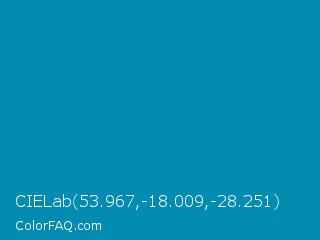 CIELab 53.967,-18.009,-28.251 Color is a normal cyan color and the nearest color is Blue Munsell #0093af. Hex code #028cb1 and RGB value is rgb(2,140,177). In RGB color space, this color is composed of 1% red, 55% green, 69% blue, In CMYK color space, this color is composed of 99% cyan, 21% magenta, 0% yellow , 31% black , In HSL color space, this color has a hue angle of 193° , 98% saturation and 35% lightness.