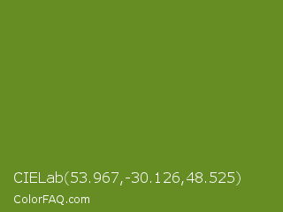 CIELab 53.967,-30.126,48.525 Color is a normal green color and the nearest color is Olive Drab #6b8e23. Hex code #658d24 and RGB value is rgb(101,141,36). In RGB color space, this color is composed of 40% red, 55% green, 14% blue, In CMYK color space, this color is composed of 28% cyan, 0% magenta, 74% yellow , 45% black , In HSL color space, this color has a hue angle of 83° , 59% saturation and 35% lightness.