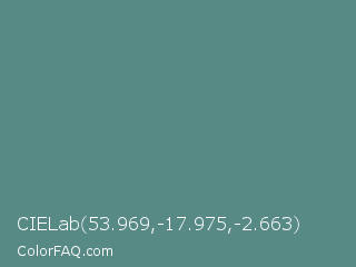 CIELab 53.969,-17.975,-2.663 Color is a normal cyan color and the nearest color is Wintergreen Dream #56887d. Hex code #588a85 and RGB value is rgb(88,138,133). In RGB color space, this color is composed of 35% red, 54% green, 52% blue, In CMYK color space, this color is composed of 36% cyan, 0% magenta, 4% yellow , 46% black , In HSL color space, this color has a hue angle of 174° , 22% saturation and 44% lightness.