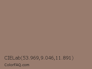 CIELab 53.969,9.046,11.891 Color is a normal orange color and the nearest color is Almond Frost #907b71. Hex code #987b6d and RGB value is rgb(152,123,109). In RGB color space, this color is composed of 60% red, 48% green, 43% blue, In CMYK color space, this color is composed of 0% cyan, 19% magenta, 28% yellow , 40% black , In HSL color space, this color has a hue angle of 20° , 17% saturation and 51% lightness.
