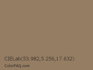 CIELab 53.982,5.256,17.632 Color is a normal orange color and the nearest color is Domino #8e775e. Hex code #957d63 and RGB value is rgb(149,125,99). In RGB color space, this color is composed of 58% red, 49% green, 39% blue, In CMYK color space, this color is composed of 0% cyan, 16% magenta, 34% yellow , 42% black , In HSL color space, this color has a hue angle of 31° , 20% saturation and 49% lightness.