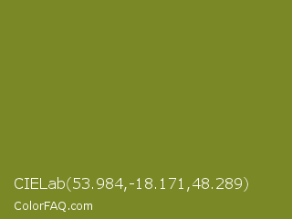CIELab 53.984,-18.171,48.289 Color is a normal yellow color and the nearest color is Wasabi #788a25. Hex code #7b8826 and RGB value is rgb(123,136,38). In RGB color space, this color is composed of 48% red, 53% green, 15% blue, In CMYK color space, this color is composed of 10% cyan, 0% magenta, 72% yellow , 47% black , In HSL color space, this color has a hue angle of 68° , 56% saturation and 34% lightness.