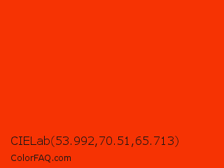 CIELab 53.992,70.51,65.713 Color is a normal red color and the nearest color is Coquelicot #ff3800. Hex code #f63303 and RGB value is rgb(246,51,3). In RGB color space, this color is composed of 96% red, 20% green, 1% blue, In CMYK color space, this color is composed of 0% cyan, 79% magenta, 99% yellow , 4% black , In HSL color space, this color has a hue angle of 12° , 98% saturation and 49% lightness.