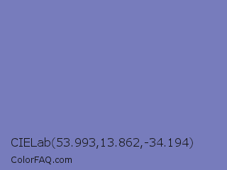 CIELab 53.993,13.862,-34.194 Color is a normal blue color and the nearest color is Wild Blue Yonder #7a89b8. Hex code #777cbc and RGB value is rgb(119,124,188). In RGB color space, this color is composed of 47% red, 49% green, 74% blue, In CMYK color space, this color is composed of 37% cyan, 34% magenta, 0% yellow , 26% black , In HSL color space, this color has a hue angle of 236° , 34% saturation and 60% lightness.