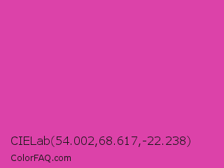 CIELab 54.002,68.617,-22.238 Color is a normal magenta color and the nearest color is Frostbite #e936a7. Hex code #dc42a9 and RGB value is rgb(220,66,169). In RGB color space, this color is composed of 86% red, 26% green, 66% blue, In CMYK color space, this color is composed of 0% cyan, 70% magenta, 23% yellow , 14% black , In HSL color space, this color has a hue angle of 320° , 69% saturation and 56% lightness.