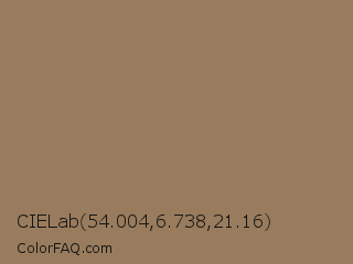 CIELab 54.004,6.738,21.16 Color is a normal orange color and the nearest color is Chamoisee #a0785a. Hex code #997c5d and RGB value is rgb(153,124,93). In RGB color space, this color is composed of 60% red, 49% green, 36% blue, In CMYK color space, this color is composed of 0% cyan, 19% magenta, 39% yellow , 40% black , In HSL color space, this color has a hue angle of 31° , 24% saturation and 48% lightness.