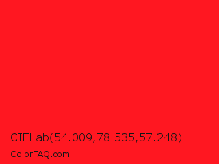 CIELab 54.009,78.535,57.248 Color is a normal red color and the nearest color is Vivid Red #f70d1a. Hex code #ff1721 and RGB value is rgb(255,23,33). In RGB color space, this color is composed of 100% red, 9% green, 13% blue, In CMYK color space, this color is composed of 0% cyan, 91% magenta, 87% yellow , 0% black , In HSL color space, this color has a hue angle of 357° , 100% saturation and 55% lightness.