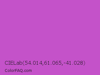 CIELab 54.014,61.065,-41.028 Color is a normal magenta color and the nearest color is Fuchsia Pink #c154c1. Hex code #c452c9 and RGB value is rgb(196,82,201). In RGB color space, this color is composed of 77% red, 32% green, 79% blue, In CMYK color space, this color is composed of 2% cyan, 59% magenta, 0% yellow , 21% black , In HSL color space, this color has a hue angle of 297° , 52% saturation and 55% lightness.