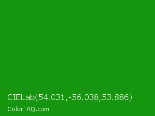 CIELab 54.031,-56.038,53.886 Color is a normal green color and the nearest color is India Green #138808. Hex code #15960e and RGB value is rgb(21,150,14). In RGB color space, this color is composed of 8% red, 59% green, 5% blue, In CMYK color space, this color is composed of 86% cyan, 0% magenta, 91% yellow , 41% black , In HSL color space, this color has a hue angle of 117° , 83% saturation and 32% lightness.