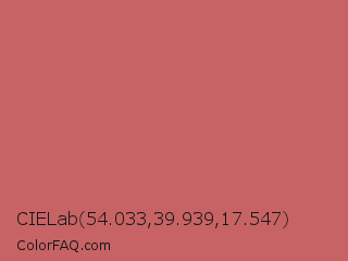 CIELab 54.033,39.939,17.547 Color is a normal red color and the nearest color is Fuzzy Wuzzy #cc6666. Hex code #c76365 and RGB value is rgb(199,99,101). In RGB color space, this color is composed of 78% red, 39% green, 40% blue, In CMYK color space, this color is composed of 0% cyan, 50% magenta, 49% yellow , 22% black , In HSL color space, this color has a hue angle of 359° , 47% saturation and 58% lightness.