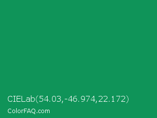 CIELab 54.03,-46.974,22.172 Color is a normal green color and the nearest color is Spanish Green #009150. Hex code #0f9459 and RGB value is rgb(15,148,89). In RGB color space, this color is composed of 6% red, 58% green, 35% blue, In CMYK color space, this color is composed of 90% cyan, 0% magenta, 40% yellow , 42% black , In HSL color space, this color has a hue angle of 153° , 82% saturation and 32% lightness.