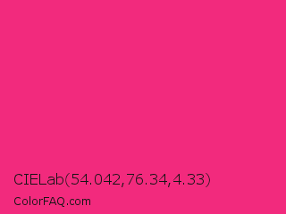 CIELab 54.042,76.34,4.33 Color is a normal rose color and the nearest color is Cerise Pink #ec3b83. Hex code #f22a7d and RGB value is rgb(242,42,125). In RGB color space, this color is composed of 95% red, 16% green, 49% blue, In CMYK color space, this color is composed of 0% cyan, 83% magenta, 48% yellow , 5% black , In HSL color space, this color has a hue angle of 335° , 88% saturation and 56% lightness.