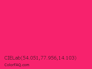 CIELab 54.051,77.956,14.103 Color is a normal rose color and the nearest color is Razzmatazz #e3256b. Hex code #f7226d and RGB value is rgb(247,34,109). In RGB color space, this color is composed of 97% red, 13% green, 43% blue, In CMYK color space, this color is composed of 0% cyan, 86% magenta, 56% yellow , 3% black , In HSL color space, this color has a hue angle of 339° , 93% saturation and 55% lightness.