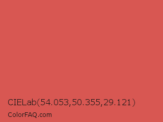 CIELab 54.053,50.355,29.121 Color is a normal red color and the nearest color is Jelly Bean #da614e. Hex code #d85752 and RGB value is rgb(216,87,82). In RGB color space, this color is composed of 85% red, 34% green, 32% blue, In CMYK color space, this color is composed of 0% cyan, 60% magenta, 62% yellow , 15% black , In HSL color space, this color has a hue angle of 2° , 63% saturation and 58% lightness.