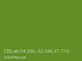 CIELab 54.056,-32.049,47.774 Color is a normal green color and the nearest color is Olive Drab #6b8e23. Hex code #618e26 and RGB value is rgb(97,142,38). In RGB color space, this color is composed of 38% red, 56% green, 15% blue, In CMYK color space, this color is composed of 32% cyan, 0% magenta, 73% yellow , 44% black , In HSL color space, this color has a hue angle of 86° , 58% saturation and 35% lightness.