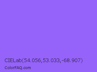 CIELab 54.056,53.033,-68.907 Color is a light indigo color and the nearest color is Navy Purple #9457eb. Hex code #9562fa and RGB value is rgb(149,98,250). In RGB color space, this color is composed of 58% red, 38% green, 98% blue, In CMYK color space, this color is composed of 40% cyan, 61% magenta, 0% yellow , 2% black , In HSL color space, this color has a hue angle of 260° , 94% saturation and 68% lightness.