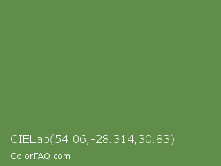 CIELab 54.06,-28.314,30.83 Color is a normal green color and the nearest color is Hippie Green #53824b. Hex code #608d4a and RGB value is rgb(96,141,74). In RGB color space, this color is composed of 38% red, 55% green, 29% blue, In CMYK color space, this color is composed of 32% cyan, 0% magenta, 48% yellow , 45% black , In HSL color space, this color has a hue angle of 100° , 31% saturation and 42% lightness.