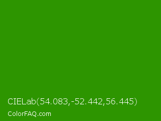 CIELab 54.083,-52.442,56.445 Color is a dark green color and the nearest color is Napier Green #2a8000. Hex code #2d9500 and RGB value is rgb(45,149,0). In RGB color space, this color is composed of 18% red, 58% green, 0% blue, In CMYK color space, this color is composed of 70% cyan, 0% magenta, 100% yellow , 42% black , In HSL color space, this color has a hue angle of 102° , 100% saturation and 29% lightness.