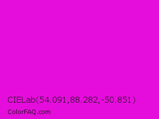 CIELab 54.091,88.282,-50.851 Color is a normal magenta color and the nearest color is Deep Magenta #cc00cc. Hex code #e50ddb and RGB value is rgb(229,13,219). In RGB color space, this color is composed of 90% red, 5% green, 86% blue, In CMYK color space, this color is composed of 0% cyan, 94% magenta, 4% yellow , 10% black , In HSL color space, this color has a hue angle of 303° , 89% saturation and 47% lightness.