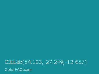 CIELab 54.103,-27.249,-13.657 Color is a normal cyan color and the nearest color is Blue Chill #0c8990. Hex code #158f98 and RGB value is rgb(21,143,152). In RGB color space, this color is composed of 8% red, 56% green, 60% blue, In CMYK color space, this color is composed of 86% cyan, 6% magenta, 0% yellow , 40% black , In HSL color space, this color has a hue angle of 184° , 76% saturation and 34% lightness.
