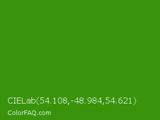CIELab 54.108,-48.984,54.621 Color is a normal green color and the nearest color is La Palma #368716. Hex code #39940c and RGB value is rgb(57,148,12). In RGB color space, this color is composed of 22% red, 58% green, 5% blue, In CMYK color space, this color is composed of 61% cyan, 0% magenta, 92% yellow , 42% black , In HSL color space, this color has a hue angle of 100° , 85% saturation and 31% lightness.