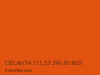 CIELab 54.111,53.296,60.803 Color is a normal orange color and the nearest color is Trinidad #e64e03. Hex code #e15210 and RGB value is rgb(225,82,16). In RGB color space, this color is composed of 88% red, 32% green, 6% blue, In CMYK color space, this color is composed of 0% cyan, 64% magenta, 93% yellow , 12% black , In HSL color space, this color has a hue angle of 19° , 87% saturation and 47% lightness.