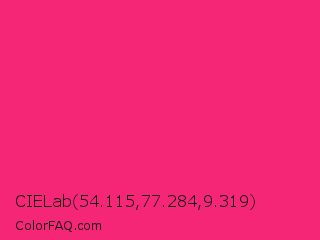 CIELab 54.115,77.284,9.319 Color is a normal rose color and the nearest color is Razzmatazz #e3256b. Hex code #f52675 and RGB value is rgb(245,38,117). In RGB color space, this color is composed of 96% red, 15% green, 46% blue, In CMYK color space, this color is composed of 0% cyan, 84% magenta, 52% yellow , 4% black , In HSL color space, this color has a hue angle of 337° , 91% saturation and 55% lightness.
