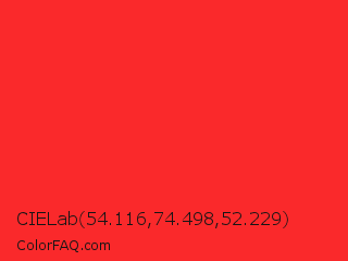CIELab 54.116,74.498,52.229 Color is a normal red color and the nearest color is Deep Carmine Pink #ef3038. Hex code #fa292b and RGB value is rgb(250,41,43). In RGB color space, this color is composed of 98% red, 16% green, 17% blue, In CMYK color space, this color is composed of 0% cyan, 84% magenta, 83% yellow , 2% black , In HSL color space, this color has a hue angle of 359° , 95% saturation and 57% lightness.