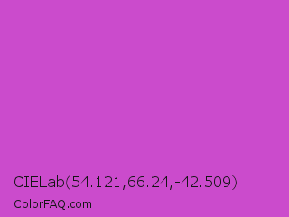 CIELab 54.121,66.24,-42.509 Color is a normal magenta color and the nearest color is Fuchsia Pink #c154c1. Hex code #cb4bcc and RGB value is rgb(203,75,204). In RGB color space, this color is composed of 80% red, 29% green, 80% blue, In CMYK color space, this color is composed of 0% cyan, 63% magenta, 0% yellow , 20% black , In HSL color space, this color has a hue angle of 300° , 56% saturation and 55% lightness.