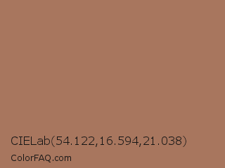 CIELab 54.122,16.594,21.038 Color is a normal orange color and the nearest color is French Beige #a67b5b. Hex code #a8765e and RGB value is rgb(168,118,94). In RGB color space, this color is composed of 66% red, 46% green, 37% blue, In CMYK color space, this color is composed of 0% cyan, 30% magenta, 44% yellow , 34% black , In HSL color space, this color has a hue angle of 19° , 30% saturation and 51% lightness.