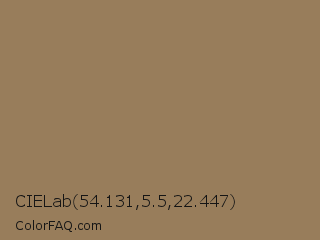 CIELab 54.131,5.5,22.447 Color is a normal orange color and the nearest color is Chamoisee #a0785a. Hex code #987d5b and RGB value is rgb(152,125,91). In RGB color space, this color is composed of 60% red, 49% green, 36% blue, In CMYK color space, this color is composed of 0% cyan, 18% magenta, 40% yellow , 40% black , In HSL color space, this color has a hue angle of 33° , 25% saturation and 48% lightness.