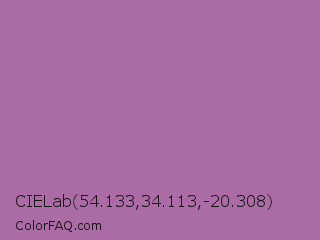 CIELab 54.133,34.113,-20.308 Color is a normal magenta color and the nearest color is Pearly Purple #b768a2. Hex code #ab6ca5 and RGB value is rgb(171,108,165). In RGB color space, this color is composed of 67% red, 42% green, 65% blue, In CMYK color space, this color is composed of 0% cyan, 37% magenta, 4% yellow , 33% black , In HSL color space, this color has a hue angle of 306° , 27% saturation and 55% lightness.
