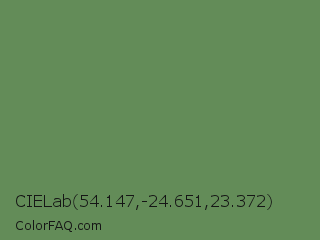 CIELab 54.147,-24.651,23.372 Color is a normal green color and the nearest color is Glade Green #61845f. Hex code #638c58 and RGB value is rgb(99,140,88). In RGB color space, this color is composed of 39% red, 55% green, 35% blue, In CMYK color space, this color is composed of 29% cyan, 0% magenta, 37% yellow , 45% black , In HSL color space, this color has a hue angle of 107° , 23% saturation and 45% lightness.