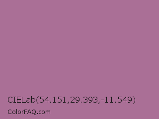 CIELab 54.151,29.393,-11.549 Color is a normal magenta color and the nearest color is Pearly Purple #b768a2. Hex code #aa6f96 and RGB value is rgb(170,111,150). In RGB color space, this color is composed of 67% red, 44% green, 59% blue, In CMYK color space, this color is composed of 0% cyan, 35% magenta, 12% yellow , 33% black , In HSL color space, this color has a hue angle of 320° , 26% saturation and 55% lightness.