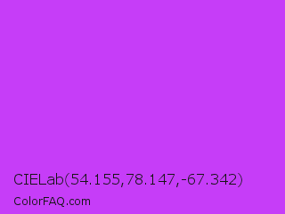 CIELab 54.155,78.147,-67.342 Color is a light purple color and the nearest color is Steel Pink #cc33cc. Hex code #c63df8 and RGB value is rgb(198,61,248). In RGB color space, this color is composed of 78% red, 24% green, 97% blue, In CMYK color space, this color is composed of 20% cyan, 75% magenta, 0% yellow , 3% black , In HSL color space, this color has a hue angle of 284° , 93% saturation and 61% lightness.