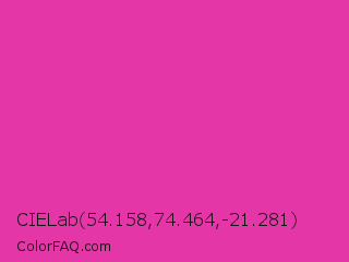 CIELab 54.158,74.464,-21.281 Color is a normal magenta color and the nearest color is Frostbite #e936a7. Hex code #e536a8 and RGB value is rgb(229,54,168). In RGB color space, this color is composed of 90% red, 21% green, 66% blue, In CMYK color space, this color is composed of 0% cyan, 76% magenta, 27% yellow , 10% black , In HSL color space, this color has a hue angle of 321° , 77% saturation and 55% lightness.