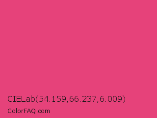 CIELab 54.159,66.237,6.009 Color is a normal rose color and the nearest color is Cerise Pink #ec3b83. Hex code #e6427a and RGB value is rgb(230,66,122). In RGB color space, this color is composed of 90% red, 26% green, 48% blue, In CMYK color space, this color is composed of 0% cyan, 71% magenta, 47% yellow , 10% black , In HSL color space, this color has a hue angle of 340° , 77% saturation and 58% lightness.