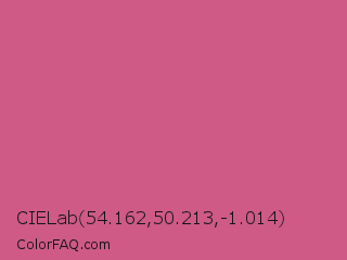 CIELab 54.162,50.213,-1.014 Color is a normal rose color and the nearest color is Cinnamon Satin #cd607e. Hex code #ce5a85 and RGB value is rgb(206,90,133). In RGB color space, this color is composed of 81% red, 35% green, 52% blue, In CMYK color space, this color is composed of 0% cyan, 56% magenta, 35% yellow , 19% black , In HSL color space, this color has a hue angle of 338° , 54% saturation and 58% lightness.
