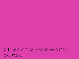 CIELab 54.172,70.058,-23.119 Color is a normal magenta color and the nearest color is Frostbite #e936a7. Hex code #de40ab and RGB value is rgb(222,64,171). In RGB color space, this color is composed of 87% red, 25% green, 67% blue, In CMYK color space, this color is composed of 0% cyan, 71% magenta, 23% yellow , 13% black , In HSL color space, this color has a hue angle of 319° , 71% saturation and 56% lightness.