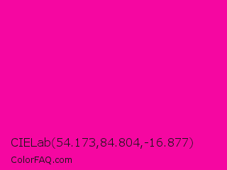 CIELab 54.173,84.804,-16.877 Color is a normal magenta color and the nearest color is Hollywood Cerise #f400a1. Hex code #f507a1 and RGB value is rgb(245,7,161). In RGB color space, this color is composed of 96% red, 3% green, 63% blue, In CMYK color space, this color is composed of 0% cyan, 97% magenta, 34% yellow , 4% black , In HSL color space, this color has a hue angle of 321° , 94% saturation and 49% lightness.