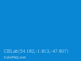 CIELab 54.182,-1.813,-47.807 Color is a normal blue color and the nearest color is Rich Electric Blue #0892d0. Hex code #0a87d4 and RGB value is rgb(10,135,212). In RGB color space, this color is composed of 4% red, 53% green, 83% blue, In CMYK color space, this color is composed of 95% cyan, 36% magenta, 0% yellow , 17% black , In HSL color space, this color has a hue angle of 203° , 91% saturation and 44% lightness.