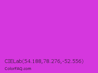 CIELab 54.188,78.276,-52.556 Color is a normal magenta color and the nearest color is Steel Pink #cc33cc. Hex code #d537de and RGB value is rgb(213,55,222). In RGB color space, this color is composed of 84% red, 22% green, 87% blue, In CMYK color space, this color is composed of 4% cyan, 75% magenta, 0% yellow , 13% black , In HSL color space, this color has a hue angle of 297° , 72% saturation and 54% lightness.