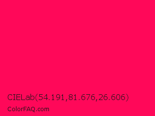 CIELab 54.191,81.676,26.606 Color is a normal rose color and the nearest color is Folly #ff004f. Hex code #ff0859 and RGB value is rgb(255,8,89). In RGB color space, this color is composed of 100% red, 3% green, 35% blue, In CMYK color space, this color is composed of 0% cyan, 97% magenta, 65% yellow , 0% black , In HSL color space, this color has a hue angle of 340° , 100% saturation and 52% lightness.