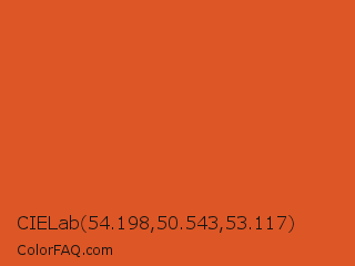CIELab 54.198,50.543,53.117 Color is a normal orange color and the nearest color is Flame #e25822. Hex code #dd5625 and RGB value is rgb(221,86,37). In RGB color space, this color is composed of 87% red, 34% green, 15% blue, In CMYK color space, this color is composed of 0% cyan, 61% magenta, 83% yellow , 13% black , In HSL color space, this color has a hue angle of 16° , 73% saturation and 51% lightness.