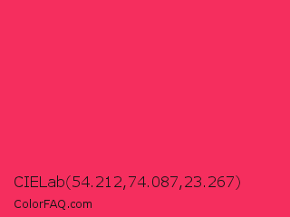 CIELab 54.212,74.087,23.267 Color is a normal red color and the nearest color is Radical Red #ff355e. Hex code #f52e5e and RGB value is rgb(245,46,94). In RGB color space, this color is composed of 96% red, 18% green, 37% blue, In CMYK color space, this color is composed of 0% cyan, 81% magenta, 62% yellow , 4% black , In HSL color space, this color has a hue angle of 346° , 91% saturation and 57% lightness.