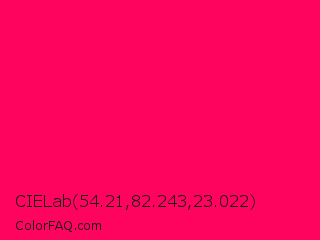 CIELab 54.21,82.243,23.022 Color is a normal rose color and the nearest color is Vivid Raspberry #ff006c. Hex code #ff045f and RGB value is rgb(255,4,95). In RGB color space, this color is composed of 100% red, 2% green, 37% blue, In CMYK color space, this color is composed of 0% cyan, 98% magenta, 63% yellow , 0% black , In HSL color space, this color has a hue angle of 338° , 100% saturation and 51% lightness.