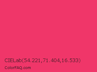 CIELab 54.221,71.404,16.533 Color is a normal rose color and the nearest color is Paradise Pink #e63e62. Hex code #f03669 and RGB value is rgb(240,54,105). In RGB color space, this color is composed of 94% red, 21% green, 41% blue, In CMYK color space, this color is composed of 0% cyan, 78% magenta, 56% yellow , 6% black , In HSL color space, this color has a hue angle of 344° , 86% saturation and 58% lightness.